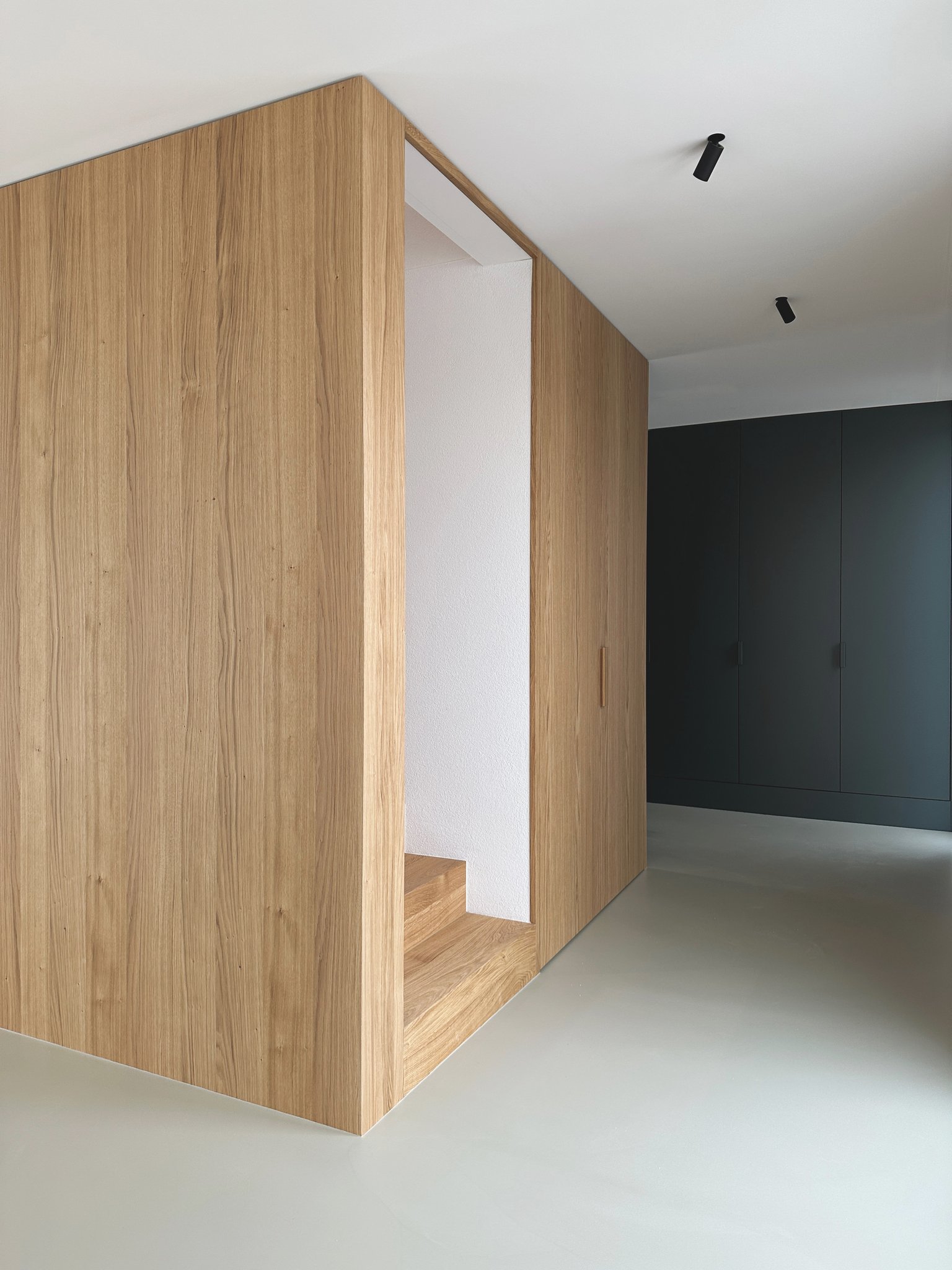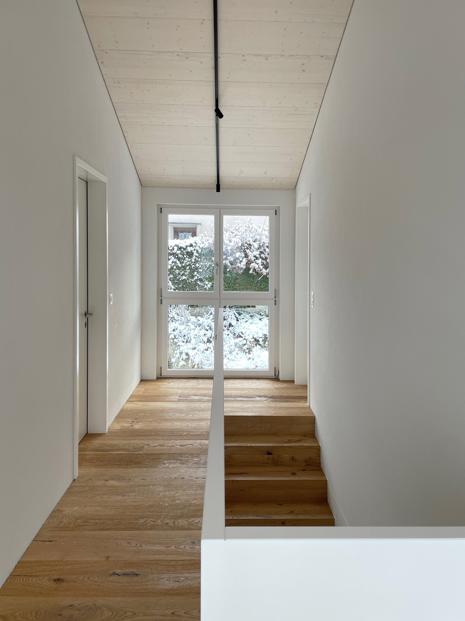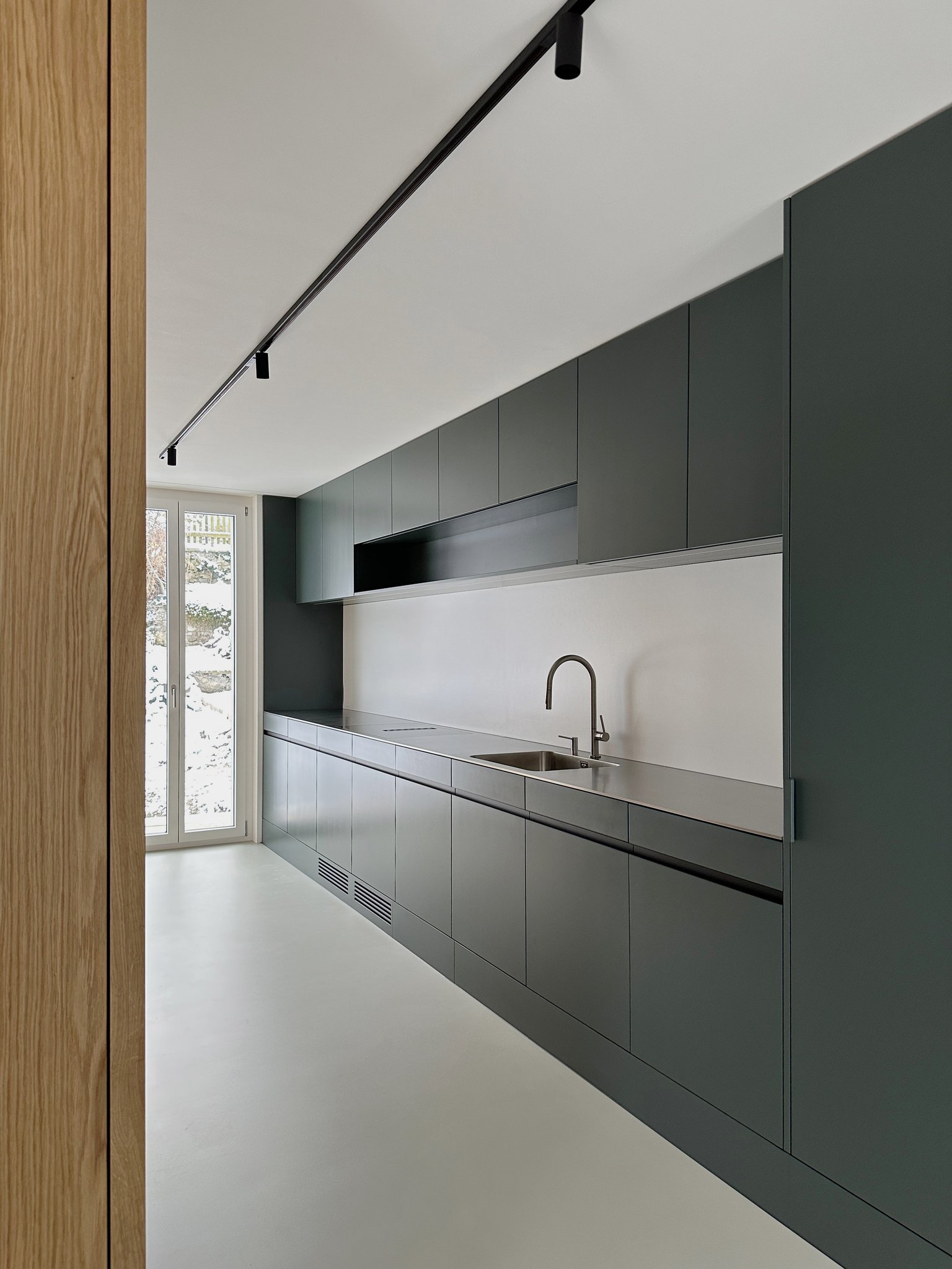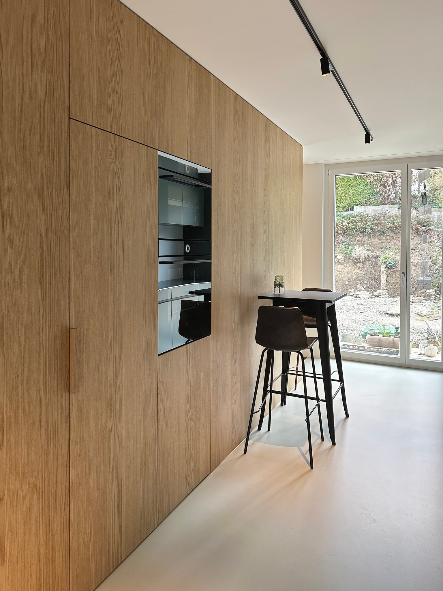 Das bestehende Reihenhaus wurde um etwa einen Drittel auf die maximal realisierbare Kubatur vergrössert. Die Fassadengestaltung fügt sich mit seiner regelmässigen Fenstereinteilung in die Reihe der bestehenden Bauten ein. Im Innern zoniert ein raumhaltiges Möbel die begrenzte Raumfläche in einen Küchen- und Wohnbereich und bietet Platz für ein Gästebad, den Treppenaufgang, die Küchenelemente und Garderobe. Mit der hochwertigen Materialisierung in Eichenholz wird es zum schmucken Dreh-und-Angelpunkt des Einfamilienhauses.