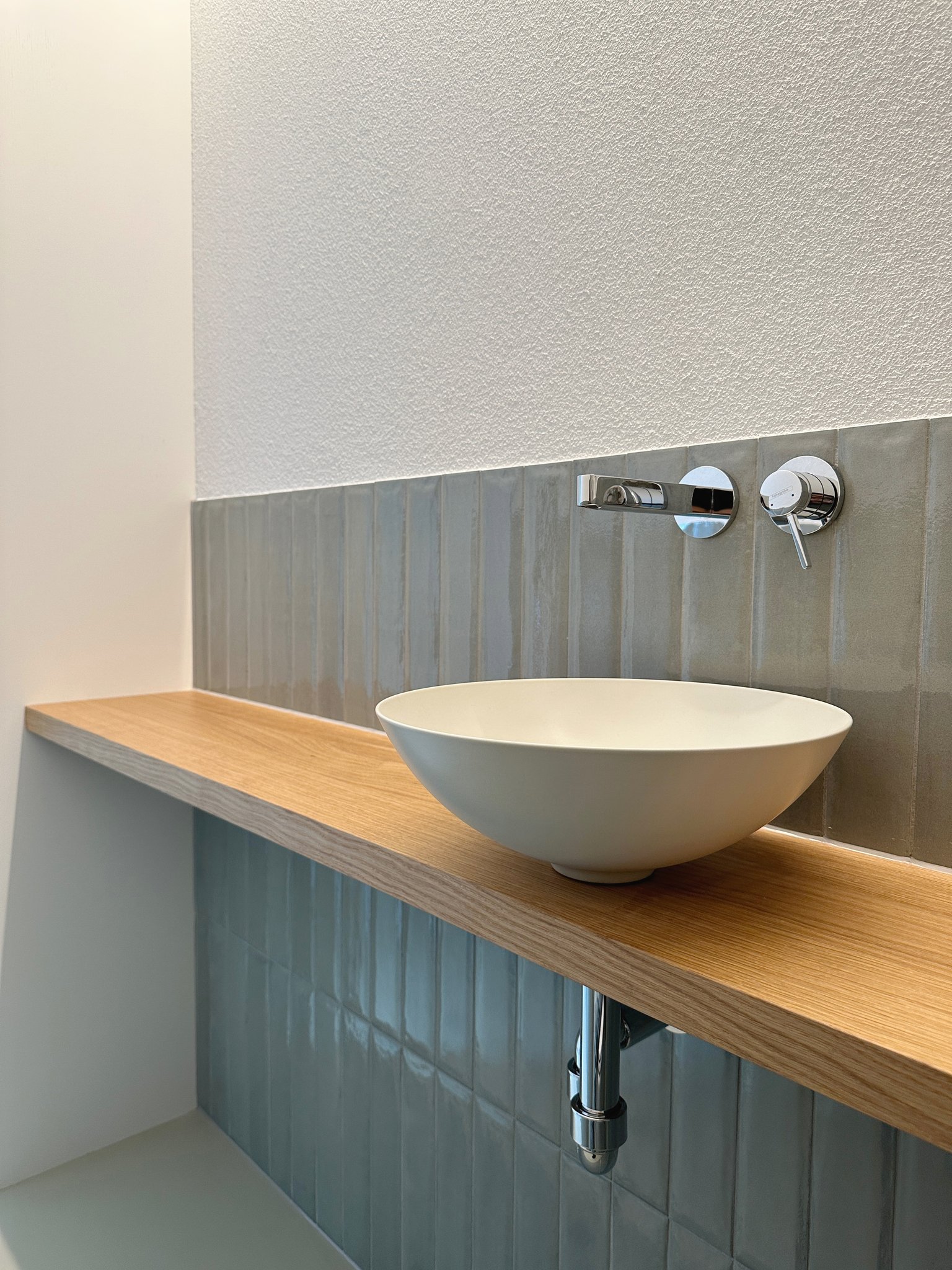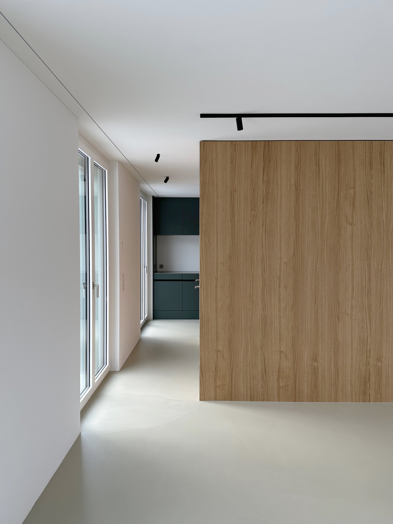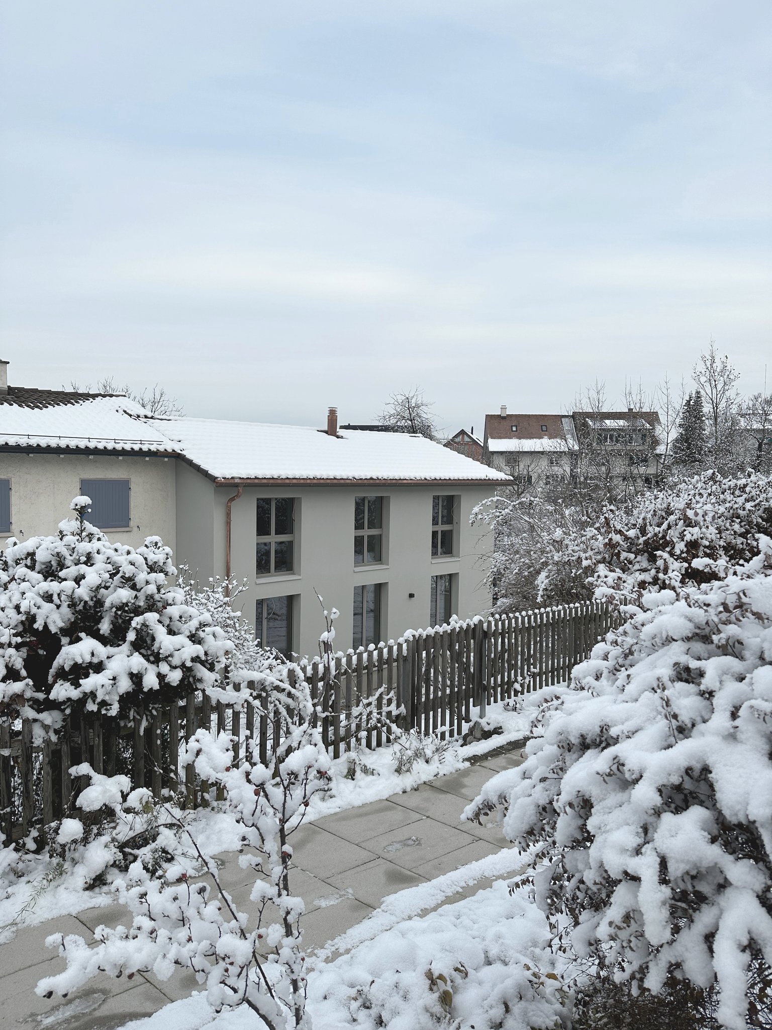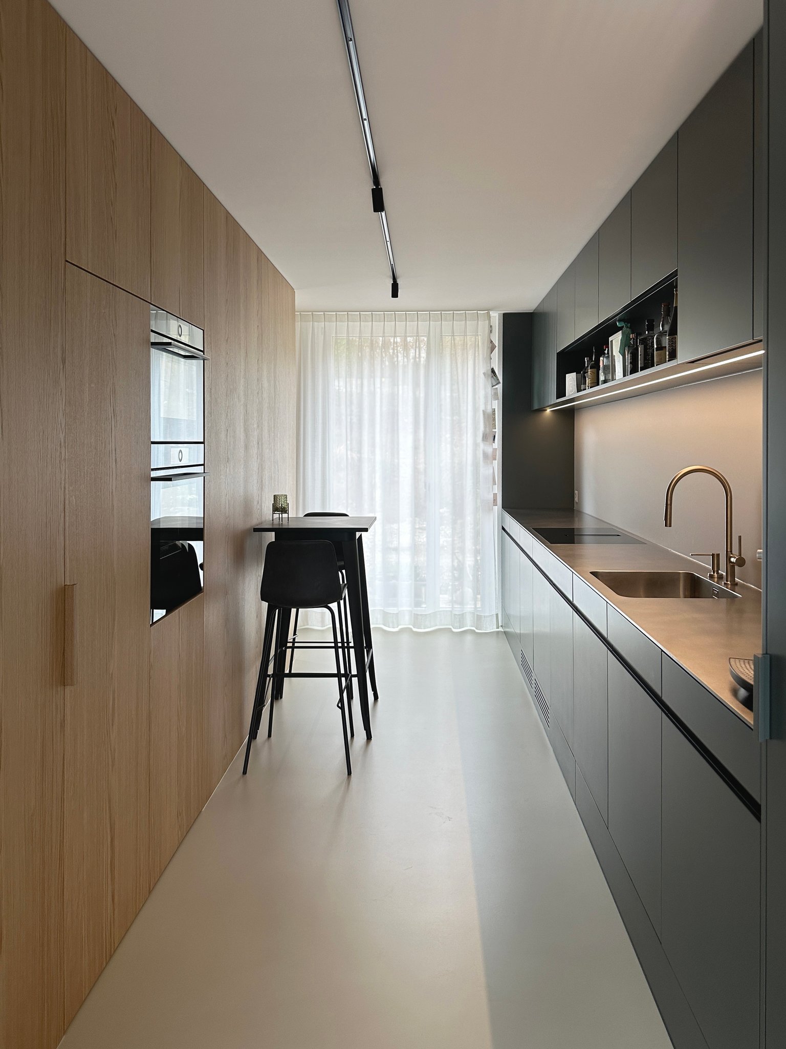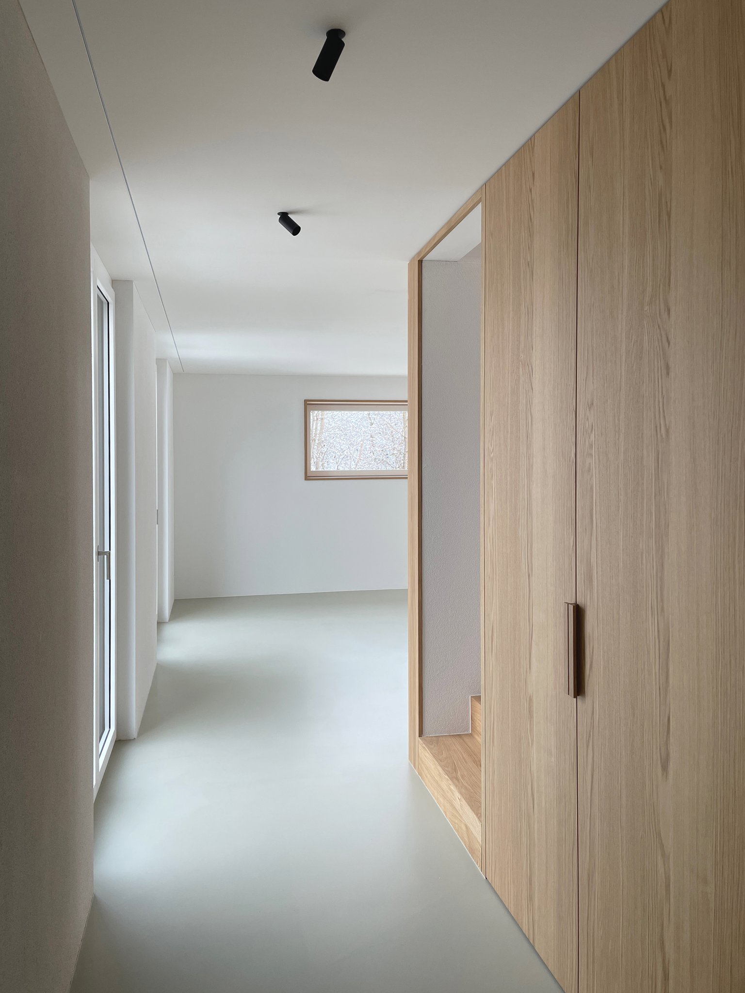 Das bestehende Reihenhaus wurde um etwa einen Drittel auf die maximal realisierbare Kubatur vergrössert. Die Fassadengestaltung fügt sich mit seiner regelmässigen Fenstereinteilung in die Reihe der bestehenden Bauten ein. Im Innern zoniert ein raumhaltiges Möbel die begrenzte Raumfläche in einen Küchen- und Wohnbereich und bietet Platz für ein Gästebad, den Treppenaufgang, die Küchenelemente und Garderobe. Mit der hochwertigen Materialisierung in Eichenholz wird es zum schmucken Dreh-und-Angelpunkt des Einfamilienhauses.
