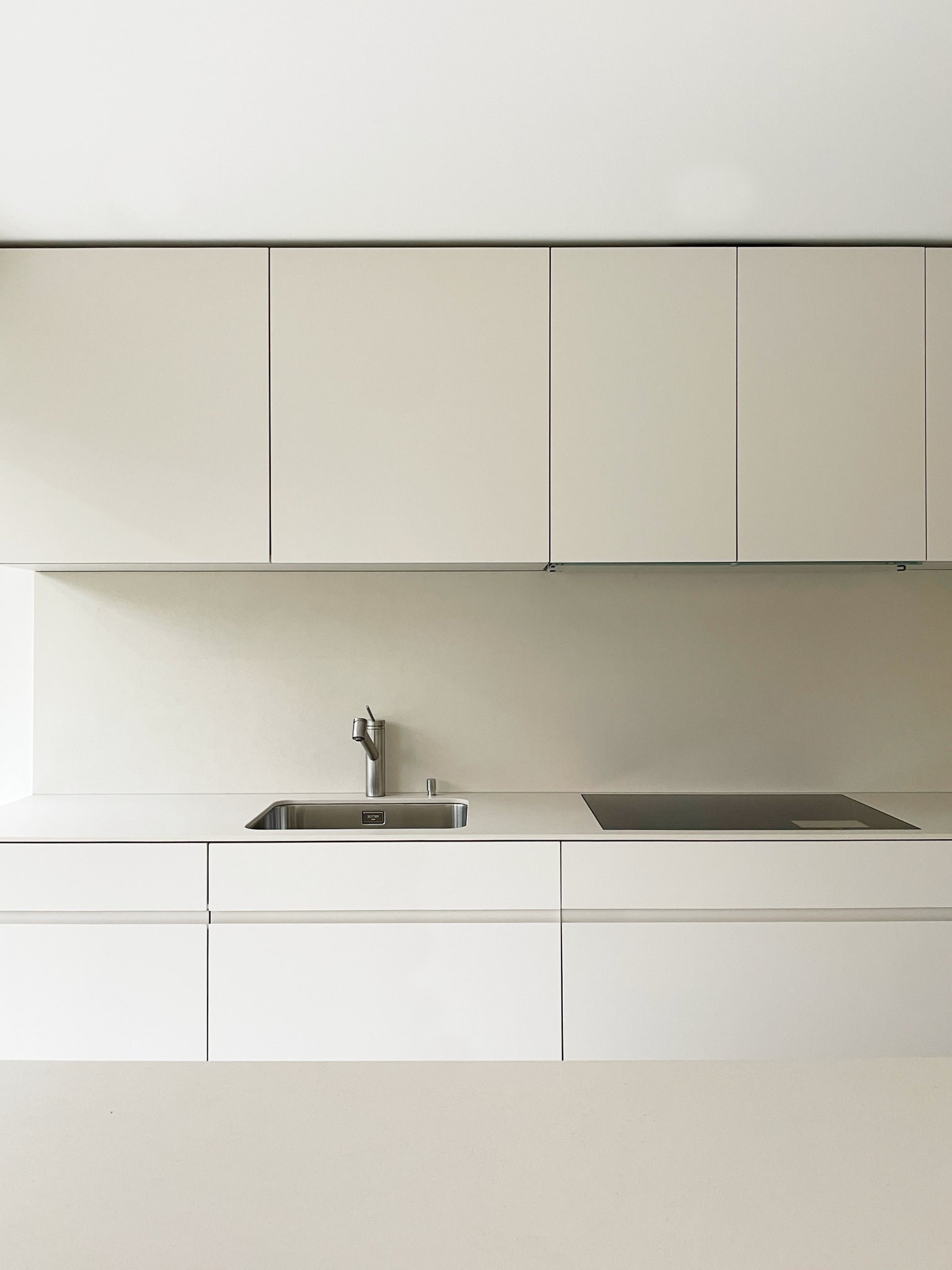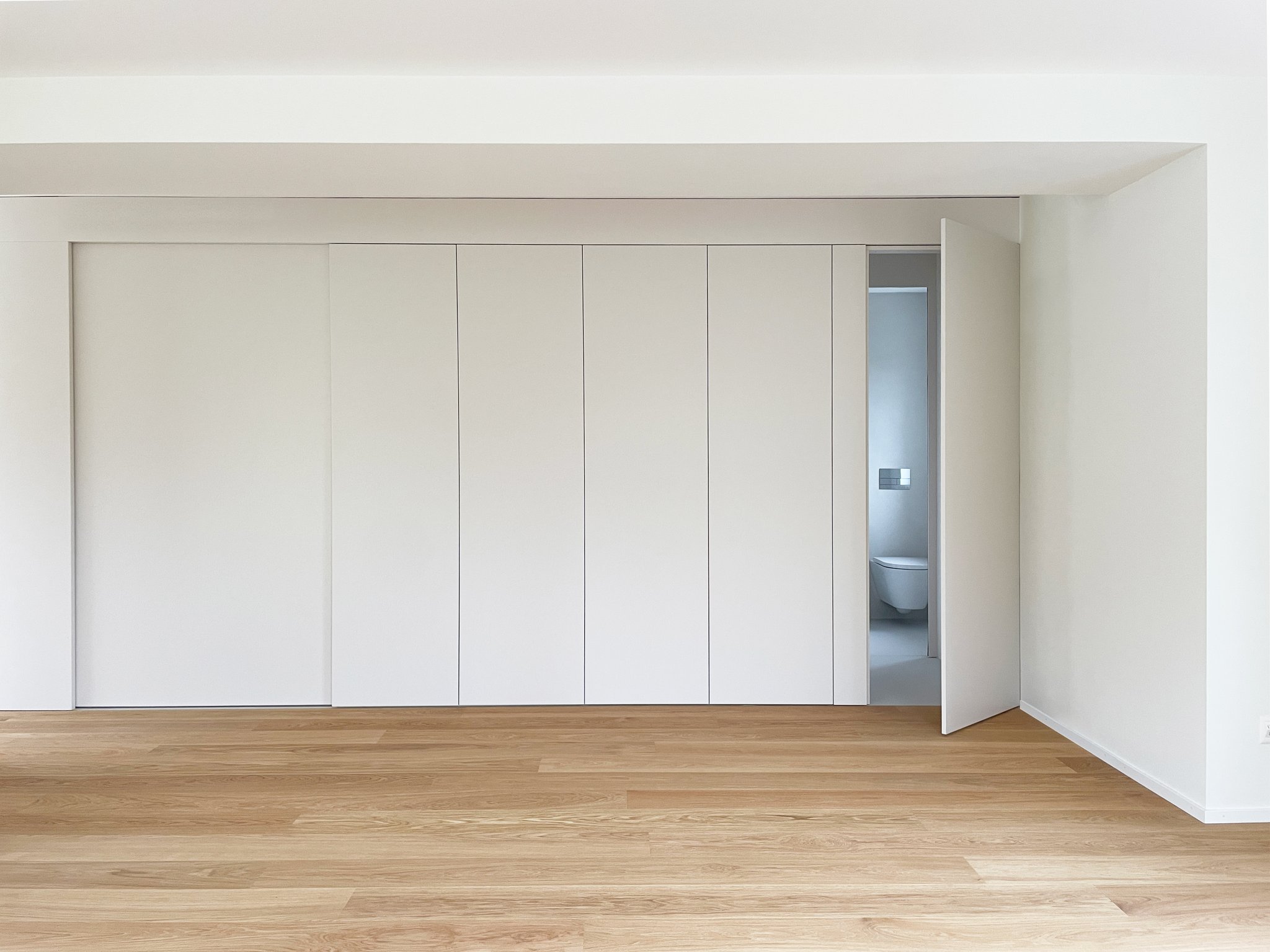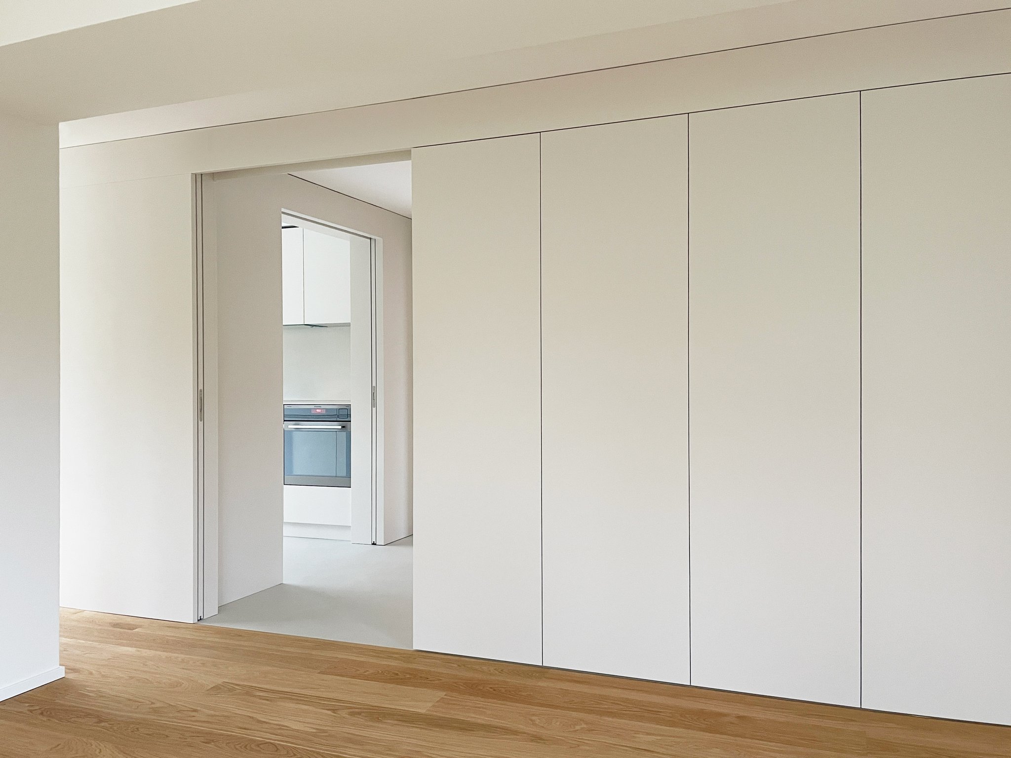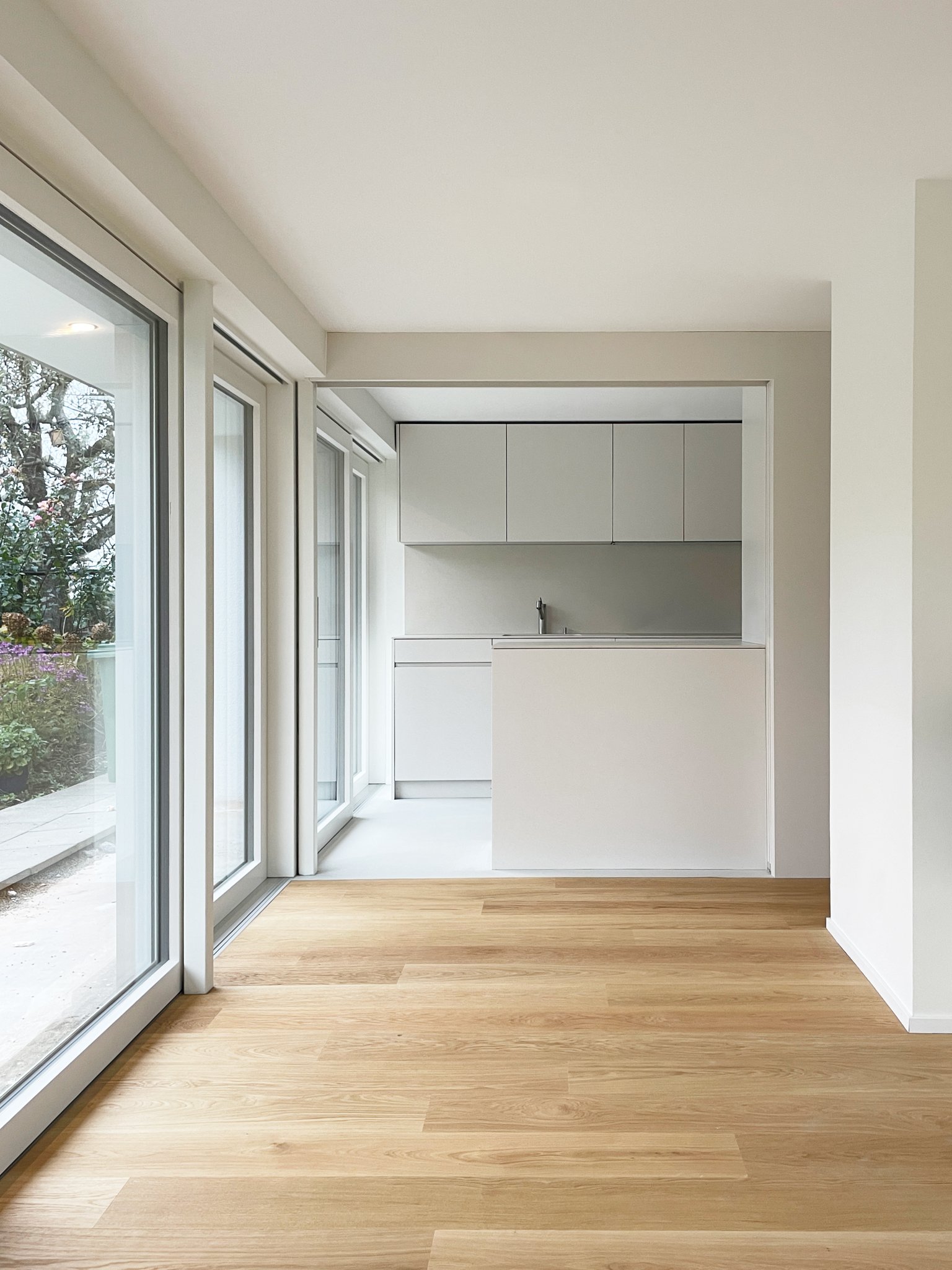 Durch einen tiefgreifenden Eingriff in der Grundrissorganisation des Erdgeschosses, gewinnt der Wohnbereich des dreissigjährigen Einfamilienhauses an Grosszügigkeit. Die Küche, das Gäste-WC und der neue Zugangsbereich werden in eine Raumschicht integriert. Der räumliche Abschluss zum Wohnraum bildet eine einheitlich gestaltete Schreinerfront. Die Wahrnehmung der beiden Raumschichten wird durch die Materialisierung betont.